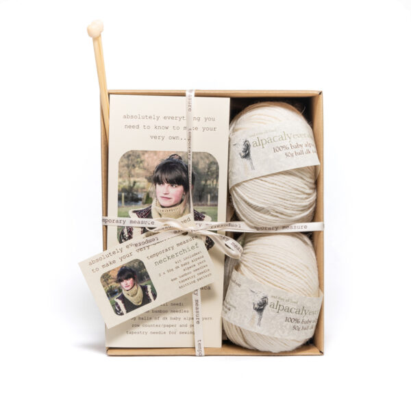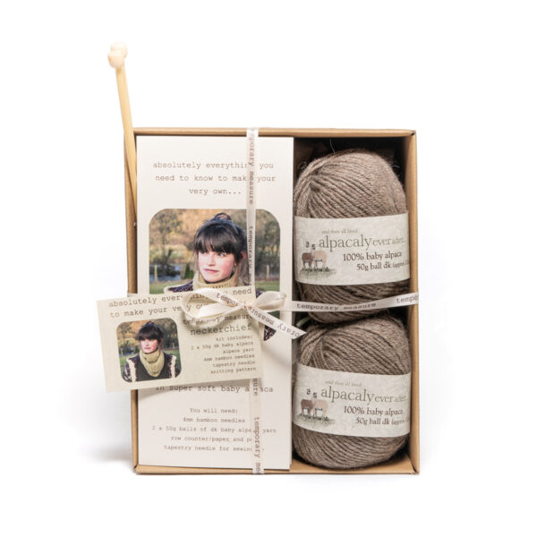Kit includes: dk 100% baby alpaca yarn, bamboo needles, tapestry needle and knitting pattern.
