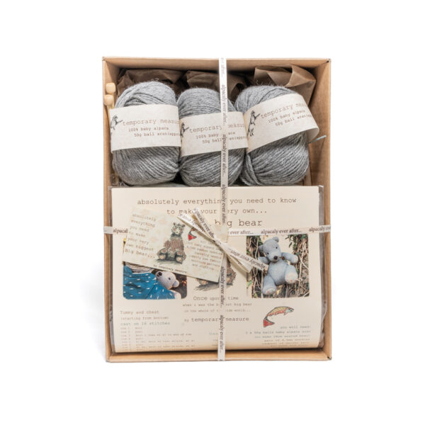 kit includes: 3 x 100% baby alpaca yarn aran, bamboo needles, tapestry needle, paw lining fabric, knitting pattern and stuffing.