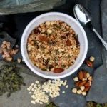 Ingredients: Gluten-Free Jumbo Oats (43%), Seeds (34%) (Sunflower Seeds, Pumpkin Seeds, Linseed), Dried Fruit (10%) (Cranberries [+ sugar, sunflower oil], Dried Apricot [+ preservative]), Nuts (8%) (Almonds, Hazelnuts), Agave Syrup (6%)