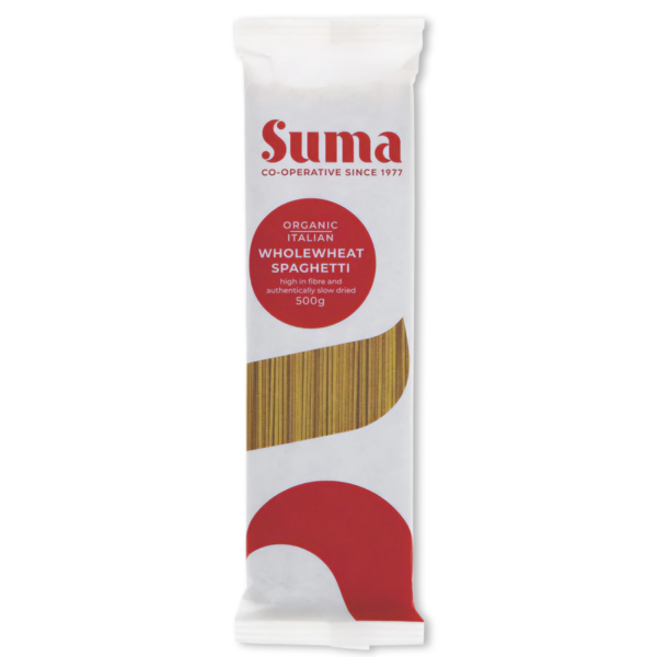 ‘Our organic wholewheat spaghetti pasta has a naturally porous and rough surface, great to hold condiments such as a classic tomato sauce or one of Suma’s tasty organic pasta sauces. Then it’s dried slowly to preserve the nutrients and bring out the taste and aromas of the wheat. Delicious! And now we’ve ditched the plastic. Our Italian organic wheat pasta is now packaged in biodegradable and recyclable paper, sourced from sustainably managed forests. Printed with water-based ink and heat-sealing lacquers without solvents. The product lasts as long as it would in plastic packaging, if stored correctly.