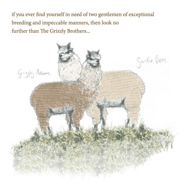 “Illustration and story of the most agreeable alpacas you could ever hope to meet now available as a greetings card (blank inside) with kraft brown envelope.”