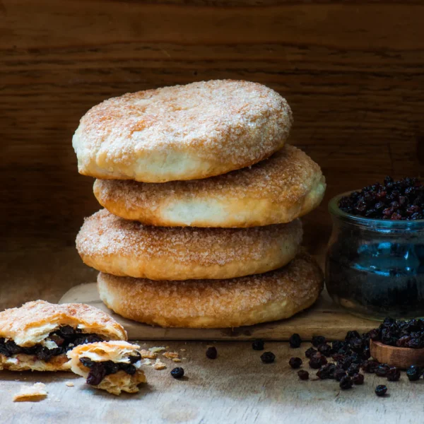 “Eccles Cakes from Williams Handbaked are quite a bit larger than your standard Eccles Cakes. We’ve been baking them to the same traditional recipe for over twenty years: We soak a mixture of vine fruits in butter and cinnamon, encase them in flaky puff pastry, and then coat each one with an egg wash and sugar sprinkle before baking to perfection!”